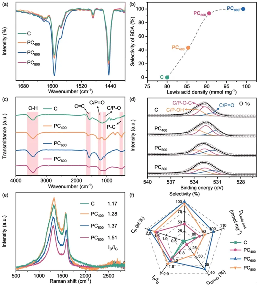 图5 a. 所合成的催化剂的吡啶红外图。b. BDA的选择性和Lewis酸位点数量之间的关联性。所合成的催化剂的c. 红外光谱图,d. O 1s XPS图谱,e. 拉曼图。f. 催化剂的物化性质对缩醛化反应的对比图。DLewis acid为Lewis酸位点的浓度,CC/O=O为C/P=O键的浓度,CP为磷原子的浓度。