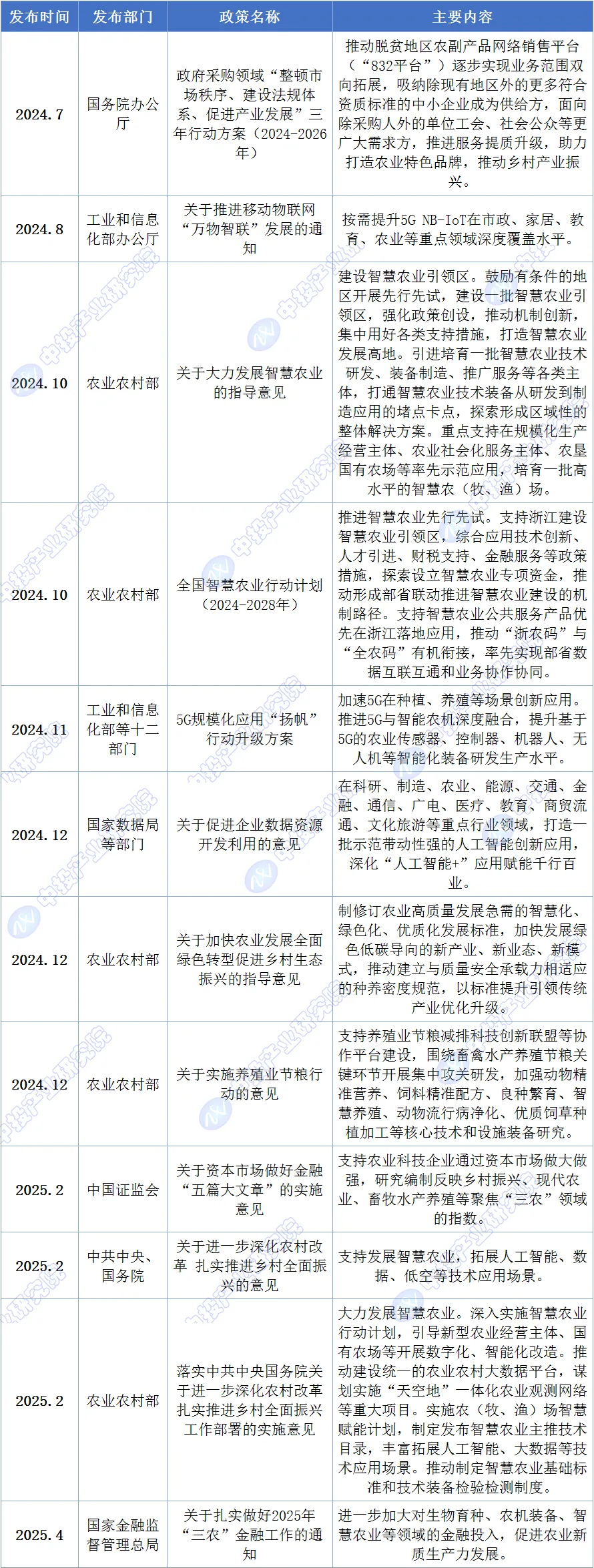 随着社会的发展,传统农业以它的淳朴厚德迎接生物技术、互联网信息技术、智能技术等先进的科技和生产方式,并不断创新蜕变,迎来智慧农业发展新时期。2024年11月22日,农业农村部印发《全国智慧农业行动计划(2024-2028年)》,提出:到2026年底,智慧农业公共服务能力初步形成,探索一批主要作物大面积单产提升智能化解决方案和智慧农(牧、渔)场技术模式,农业生产信息化率达到30%以上;到2028年底,智慧农业公共服务能力大幅提升,信息技术助力粮油作物和重要农产品节本增产增效的作用全面显现,先行先试地区农业全产业链数字化改造基本实现,全域推进智慧农业建设的机制路径基本成熟,农业生产信息化率达到32%以上。2025年4月,国家金融监督管理总局印发《关于扎实做好2025年“三农”金融工作的通知》,提出:进一步加大对生物育种、农机装备、智慧农业等领域的金融投入,促进农业新质生产力发展。