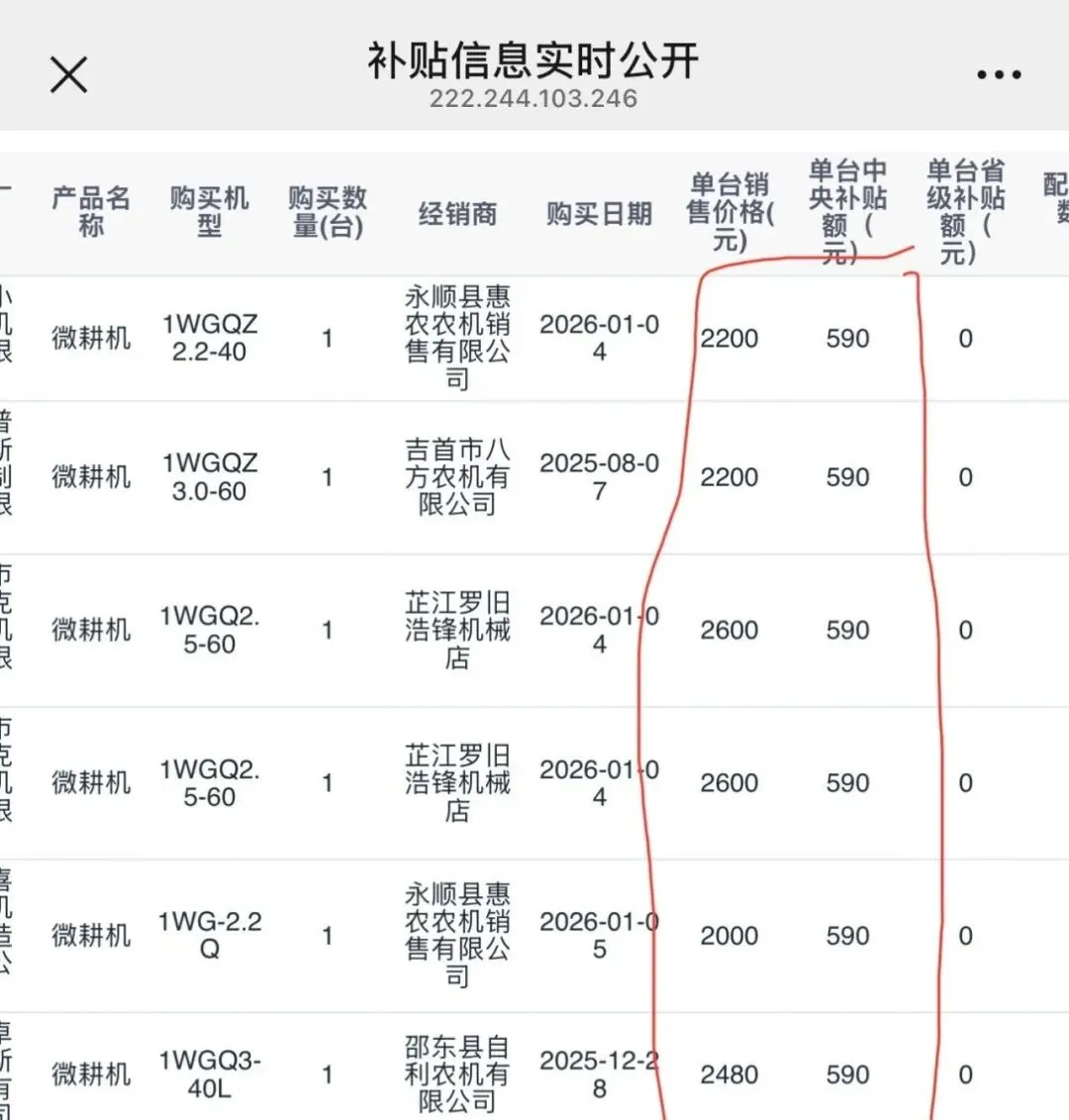 然而,在该省微耕机享受购机补贴,我们查了2026年该省执行的微耕机补贴数据,售价2000多元的微耕机,补贴590元,补贴比率达到24%左右。