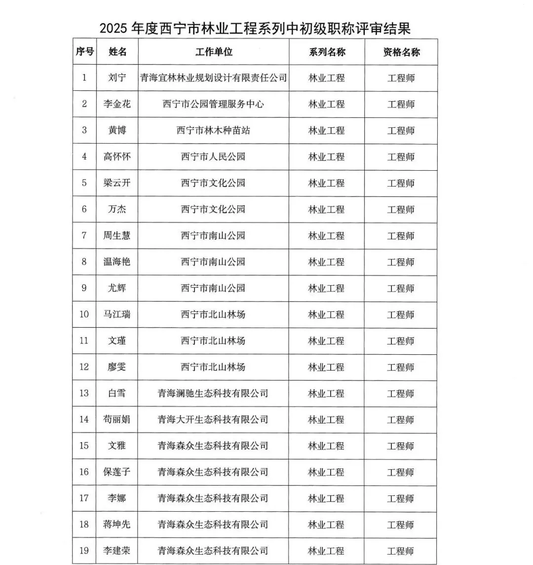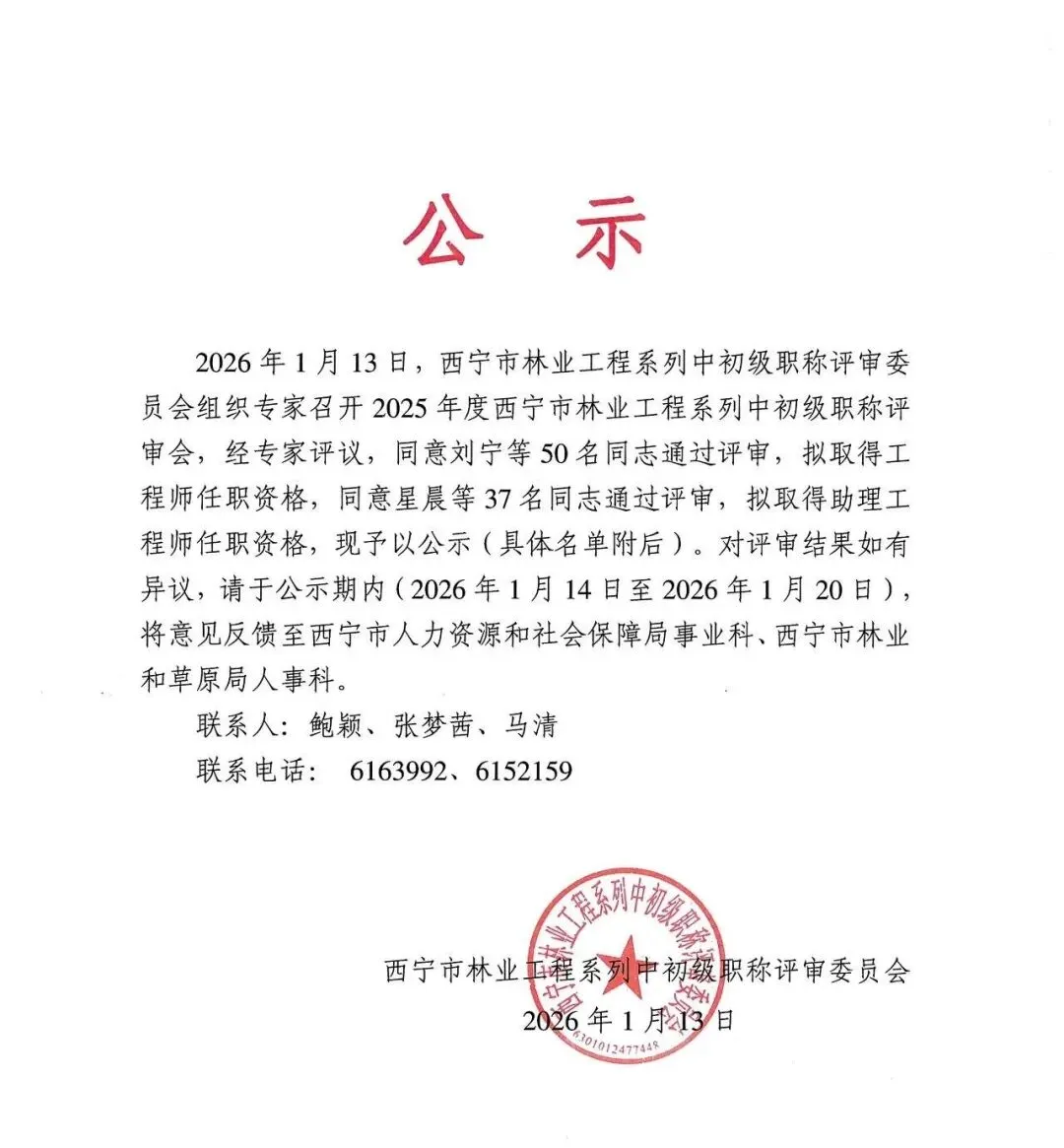 2026年1月13日,西宁市林业工程系列中初级职称评审委员会组织专家召开2025年度西宁市林业工程系列中初级职称评审会,经专家评议,同意刘宁等50名同志通过评审,拟取得工程师任职资格,同意星晨等37名同志通过评审,拟取得助理工程师任职资格,现予以公示(具体名单附后)。对评审结果如有异议,请于公示期内(2026年1月14日至2026年1月20日),将意见反馈至西宁市人力资源和社会保障局事业科、西宁市林业和草原局人事科。