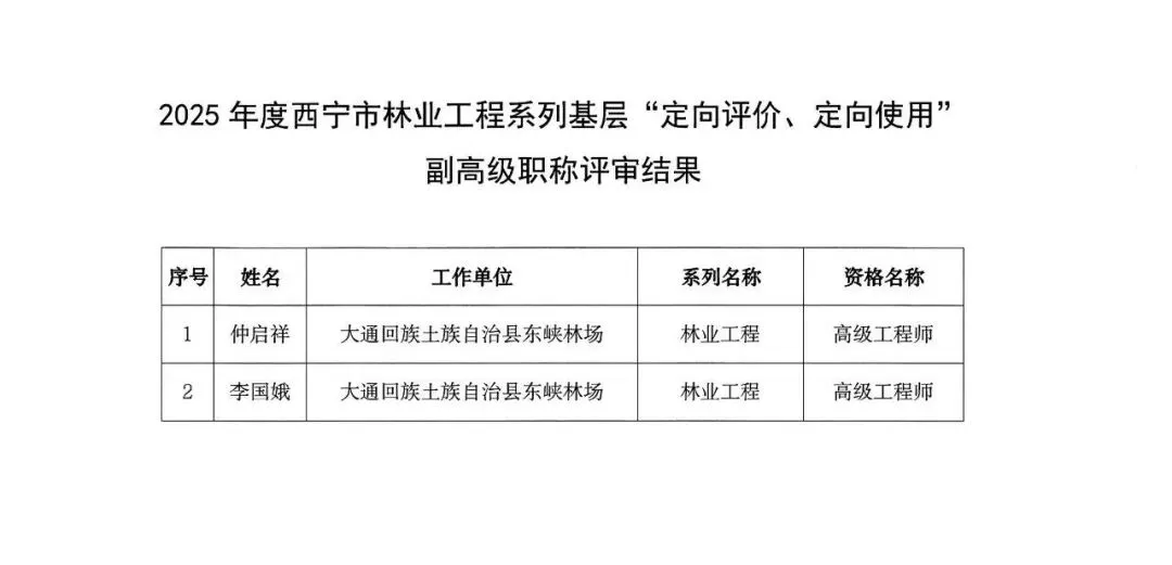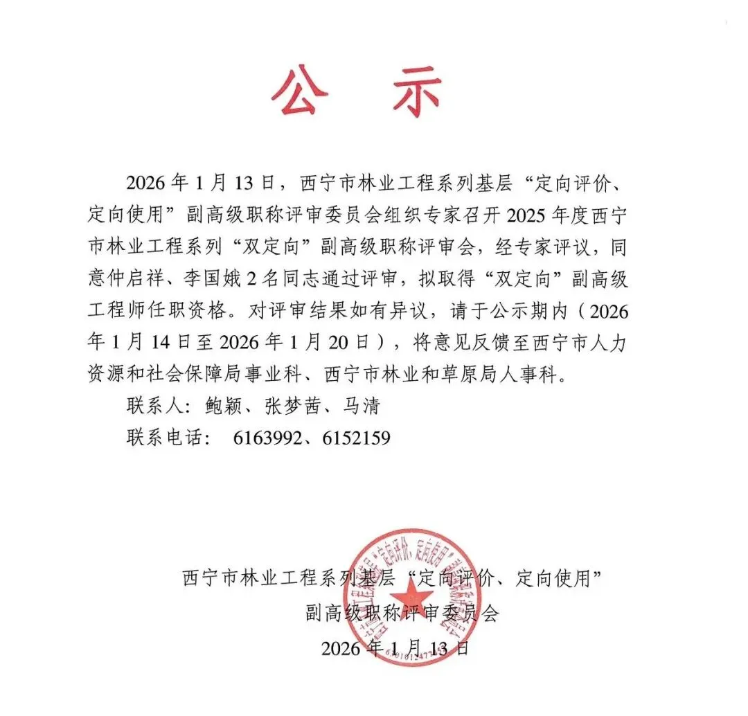 2026年1月13日,西宁市林业工程系列基层“定向评价、定向使用”副高级职称评审委员会组织专家召开2025年度西宁市林业工程系列“双定向”副高级职称评审会,经专家评议,同意仲启祥、李国娥2名同志通过评审,拟取得“双定向”副高级工程师任职资格。对评审结果如有异议,请于公示期内(2026年1月14日至2026年1月20日),将意见反馈至西宁市人力资源和社会保障局事业科、西宁市林业和草原局人事科。