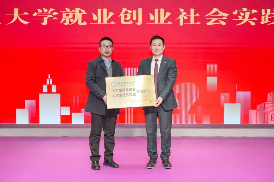 南京林业大学学生处副处长、大学生就业创业指导中心主任陈养彬为红蚂蚁装饰集团授予 “南京林业大学大学生就业创业社会实践实训基地” 牌匾,标志着校企合作迈出坚实一步,将为学校人才培养与企业人才储备提供双向支撑。