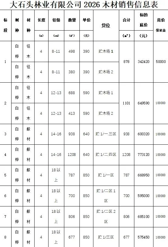 吉林长白山森工大石头林业有限公司木材网上竞价销售公告一、竞价标的概况
