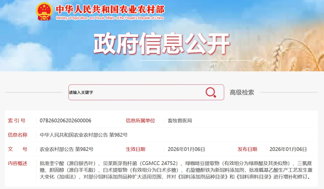 各位饲料人、养殖户注意啦!农业农村部最新发布第982号公告,一批饲料行业新规落地,涉及新增添加剂、原料增补等关键内容,直接关系养殖提质增效,快来看重点汇总!