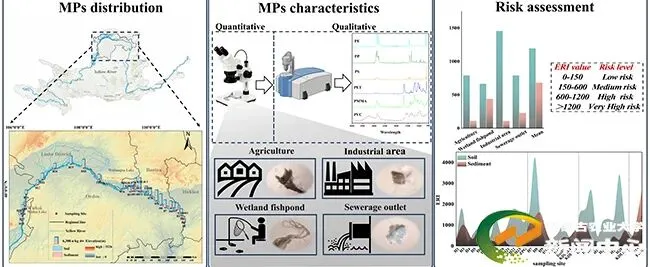 在《Journal of Hazardous Materials》发表的研究,题为“Occurrence and ecological risk of microplastics in soils and sediments in the Inner Mongolian Yellow River Basin: An analysis based on functional zoning”,通过对内蒙古黄河流域土壤/沉积物中微塑料的污染情况监测发现:该区域微塑料广泛分布,土壤中平均丰度为5503±1502 n/kg干重,沉积物中为2059±1188 n/kg干重。微塑料主要呈1-2毫米的透明纤维状,成分以聚丙烯和聚乙烯为主。空间分析显示,包头地区土壤微塑料丰度最高(6108 n/kg干重),而沉积物污染峰值出现在呼和浩特附近区域(2543 n/kg干重)。按功能分区划分,排污口(6133 n/kg干重)和工业区(5800 n/kg干重)是土壤微塑料的主要汇集区,湿地鱼塘则承载着最高浓度的沉积物微塑料(2533 n/kg干重)。在形态组成上,农用地以膜状微塑料为主(占比>23%),工业区以碎片状为主,湿地鱼塘则以纤维状为主。聚合物组成呈现空间差异:工业区土壤中聚氯乙烯和聚甲基丙烯酸甲酯含量较高,湿地沉积物中聚苯乙烯成分更突出。生态风险评估表明,工业区土壤因含毒性较强的聚氯乙烯/聚甲基丙烯酸甲酯而处于极高风险等级,湿地沉积物处于中等风险水平。该研究为黄河流域微塑料生态风险管控提供了重要的数据支撑。