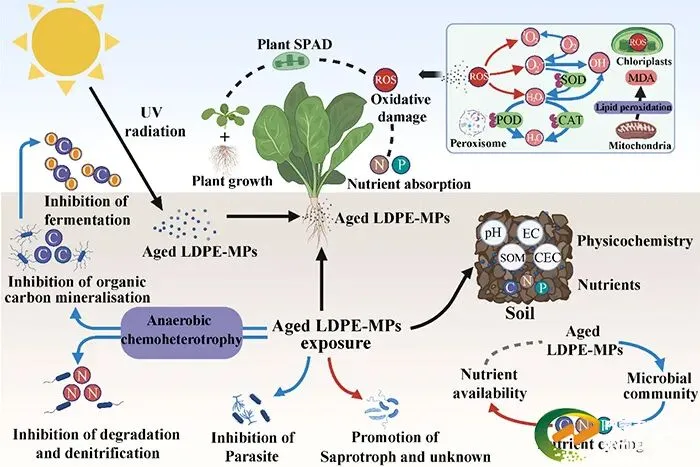 在《Environmental Pollution》发表的研究,题为“Aging reduces the negative effect of low-density polyethylene microplastics on soil-plant-microbial systems”。探究了原始与紫外老化低密度聚乙烯微塑料在不同粒径(5 μm、500 μm)与浓度(0.1%、1%)下对小白菜生长、土壤性质及微生物群落的影响。结果表明,1% 500 μm原始微塑料显著抑制小白菜生长,生物量降幅达75.9%,而老化微塑料几乎无生长抑制,且提升植株氮、磷吸收量分别达82.3%和14.2%。两种微塑料均引发氧化应激反应,提高丙二醛含量及相关酶活性。土壤方面,微塑料添加提升了有机质与阳离子交换量,其中0.1% 5 μm处理效果最显著;大粒径微塑料增加硝态氮,小粒径则提高有效磷。微生物分析显示,老化微塑料抑制碳矿化与反硝化相关细菌,但促进腐生真菌生长。结构方程模型进一步阐明,紫外老化通过减轻对植物与细菌的负面效应、增加有益真菌、稳定土壤碳氮循环,从而降低微塑料毒性。该研究为认识老化微塑料在农业生态系统中的长期风险提供了科学依据。