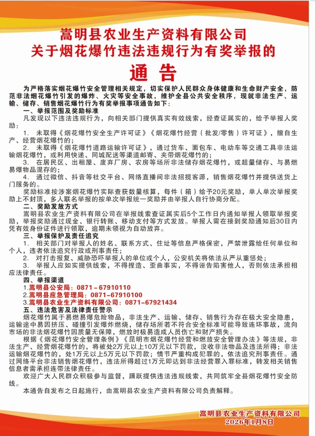 欢迎广大人民群众积极参与监督,踊跃提供违法违规线索,共同筑牢全县烟花爆竹安全防线。