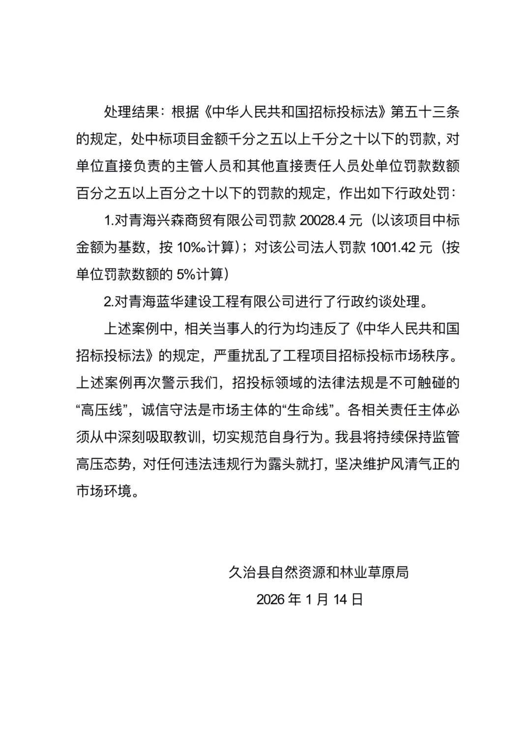 >久治县自然资源和林业草原局关于林草工程招标投标领域违法违规6起典型案例的通报