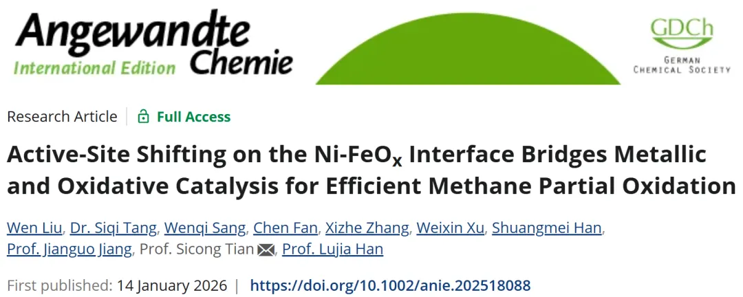 Active‐Site Shifting on the Ni‐FeO x Interface Bridges Metallic and Oxidative Catalysis for Efficient Methane Partial Oxidation. Wen Liu;Siqi Tang;Wenqi Sang;Chen Fan;Xizhe Zhang;Weixin Xu;Shuangmei Han;Jianguo Jiang;Sicong Tian;Lujia Han. ISSN: 1433-7851 , 1521-3773; DOI: 10.1002/anie.202518088. Angewandte Chemie. , 2026.