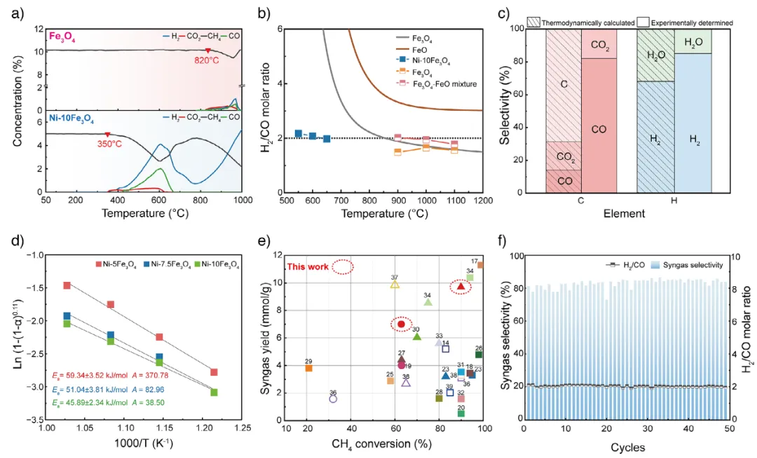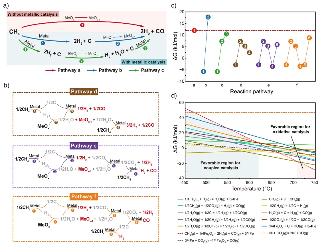 图1通过对比传统氧化催化(Pathway a)与金属-氧化耦合路径(Pathways b–f),揭示了Ni-FeOx体系在热力学上的优势。计算表明,在600–650℃范围内,耦合路径的吉布斯自由能(ΔG)显著低于单一氧化路径,说明Ni的引入使甲烷重整从单一不利反应转变为一系列有利的串联反应。该图还指出CO₂是适合再生FeOx的氧化剂,为化学循环POR(CL-POR)提供了热力学依据。