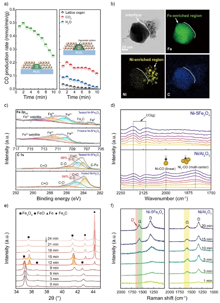通过TEM-EDXS与XPS分析(图3b–c),发现反应后碳物种主要富集在Fe区域,且出现Fe₃C特征峰,表明CHₓ⁺从Ni位点迁移至FeOx参与反应。原位DRIFTS谱(图3d)显示Ni-5Fe₃O₄上未见Ni-CO特征峰,说明CO形成位点已转移至FeOx。Raman谱(图3f)进一步证实FeOx位点抑制了石墨碳的形成,体现了其氧化刻蚀碳物种的作用。