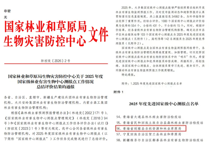 近日,国家林业和草原局生物灾害防控中心正式印发《关于2025年度国家级林业有害生物中心测报点工作情况总结评价结果的通报》,对全国多个测报点年度工作进行了全面评估。在此次评价中,刚察县自然资源和林业草原局凭借扎实的工作成效和突出的业务表现,成功获评“2025年度先进国家级中心测报点”荣誉称号。