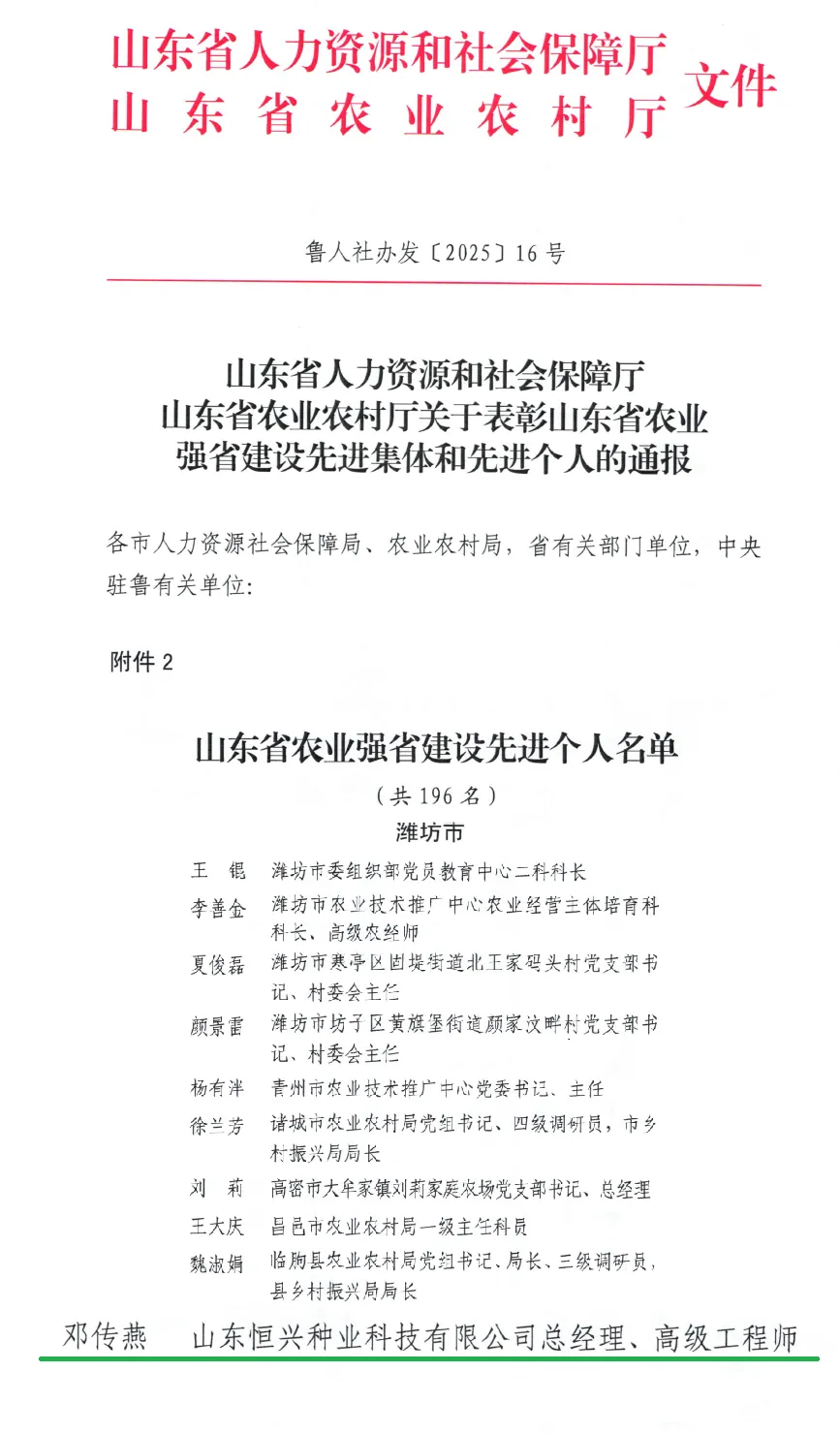 近日,山东省人社厅、山东省农业农村厅联合表彰山东省农业强省建设先进集体和先进个人,山东恒兴种业科技有限公司总经理、高级工程师邓传燕被授予“山东省农业强省建设先进个人”称号。