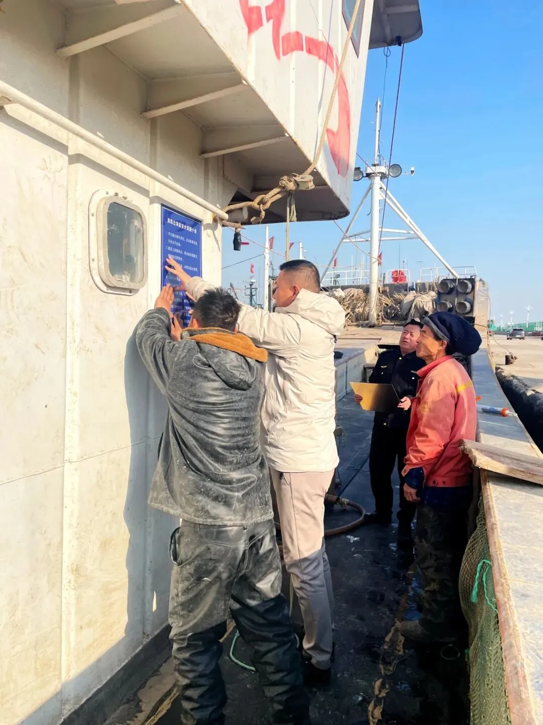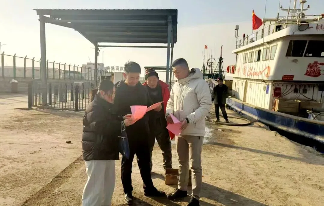 利津县办事处联合渔业主管部门深入渔港码头,创新采用“岸上宣讲+登船提醒”模式,严格把控钢质渔船驾驶室、甲板作业区等关键位置警示标牌的安装质量,同步向渔民发放安全须知单页,详细讲解冬季防风防冻、安全应急处置等要点。
