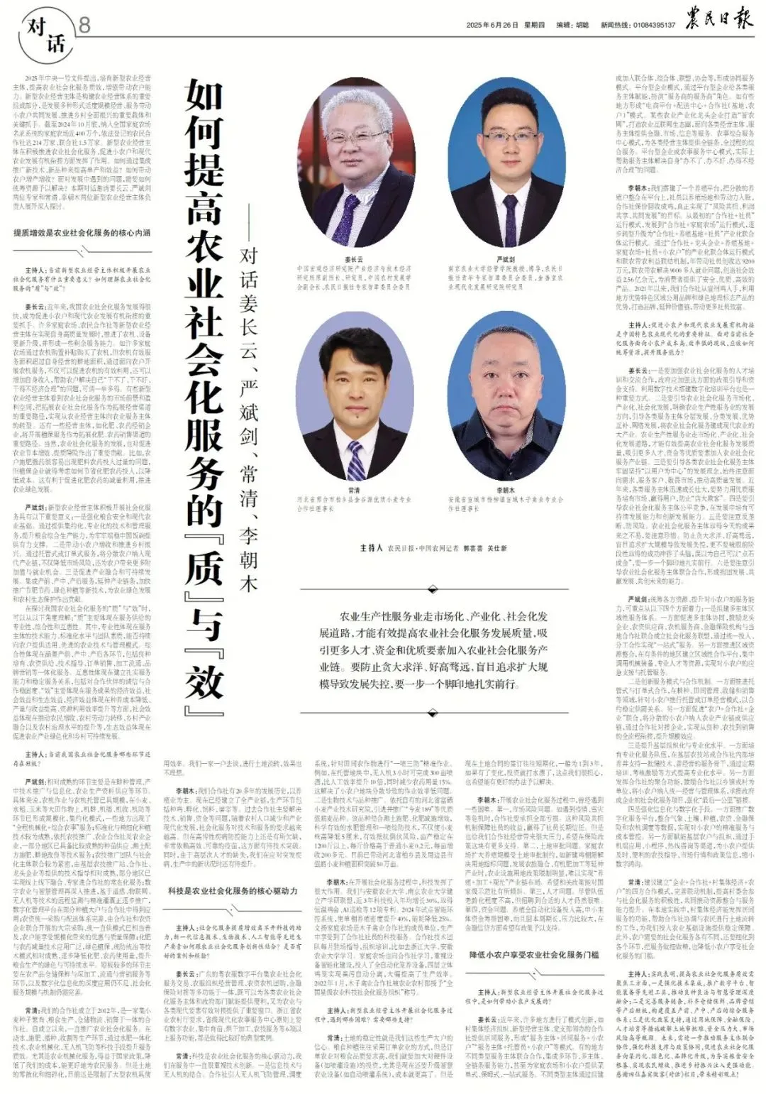 主持人:推动小农户与现代农业有机衔接是中国特色农业现代化的重要特征。面对当前社会化服务面向小农户成本高、效率低的现状,应该如何统筹资源,提升服务能力?姜长云:一是要加强农业社会化服务的人才培训和交流合作,政府应加强这方面的政策引导和资金支持。利用数字技术搭建数字化培训平台也是一种重要方式。二是要引导农业社会化服务市场化、产业化、社会化发展,明确农业生产性服务业的发展方向,引导各类服务主体分层发展、分类发展、优势互补、网络发展,将农业社会化服务建成现代农业的大产业。农业生产性服务业走市场化、产业化、社会化发展道路,才能有效提高农业社会化服务发展质量,吸引更多人才、资金等优质要素加入农业社会化服务产业链。三是要引导各类农业社会化服务主体牢固坚持“以用户为中心”的发展理念,始终注意面向需求、服务客户、敬畏市场,推动高质量发展。近年来,各类服务主体迅速成长壮大,要努力用优质服务培育市场、赢得用户,防止“店大欺客”。四是要引导农业社会化服务主体公平竞争,在发展中培育可持续发展能力和创新发展能力。五是要注意反垄断、防风险。农业社会化服务主体取得今天的成果来之不易,要注意珍惜。防止贪大求洋、好高骛远,盲目追求扩大规模导致发展失控,更不要被眼前阶段性取得的成功冲昏了头脑,误以为自己可以“点石成金”,要一步一个脚印地扎实前行。六是要注意引导农业社会化服务主体联合合作,形成抱团发展、共赢发展、共创未来能力。严斌剑:统筹各方资源、提升对小农户的服务能力,可重点从以下四个方面着力:一是组建多主体区域性服务体系。一方面促进多主体协同,鼓励龙头企业、农资供应商、农机服务商、金融保险机构与当地合作社联合成立社会化服务联盟,通过统一投入、分工合作实现“一站式”服务。另一方面推进区域资源整合,在有条件的地区建立区域性合作平台,集中调用机械装备、专业人才等资源,实现对小农户的应急支援与托管服务。二是创新服务模式与合作机制。一方面推进托管式与订单式合作,在耕种、田间管理、收储和销售等领域,针对小农户推行托管或订单经营模式,以合约稳定供需关系。另一方面促进“农户+合作社+企业”联合,将分散的小农户纳入农业产业链或供应链,通过合作社对接企业,实现从良种、农技到销售的全流程衔接,提升规模效应。三是提升基层组织化与专业化水平。一方面培育专业化服务队伍,在基层农技站或合作社内部培养并支持一批懂技术、善经营的服务骨干,通过定期培训、考核激励等方式提高专业化水平。另一方面发挥合作社的聚合功能,鼓励合作社以乡镇或村为单位,将小农户纳入统一经营与管理体系,承接政府或企业的社会化服务项目,强化“最后一公里”链接。四是强化信息化与数字化手段。一方面推广数字化服务平台,整合气象、土壤、种植、农资、金融保险和农机调度等数据,实现对小农户的精准服务与成本管控。另一方面赋能基层农户与组织,通过手机端应用、小程序、热线咨询等渠道,为小农户提供及时、便利的农技指导、市场行情和政策信息,缩小数字鸿沟。常清:建议建立“企业+合作社+村集体经济+农户”的四方合作模式,完善联动机制,提高村委会参与社会化服务的积极性,共同推动资源整合与服务能力提升。在本地实践中,村集体经济能发挥居间服务的功能,帮助合作社协调与农民进行土地流转的工作,为我们投入农业基础设施提供稳定保障。此外,农户需要的社会化服务各有不同,还要细化到各个环节,服务做细做精,也降低小农户享受社会化服务的门槛。主持人:实践表明,提升农业社会化服务质效需聚焦三方面,一是强化技术集成,推广数字平台、智能装备等先进工具,推动良种良法与智慧管理深度融合;二是完善服务链条,补齐仓储保鲜、品牌营销等产后短板,构建覆盖产前、产中、产后的综合服务体系;三是优化政策支持,通过用地保障、金融保险、人才培育等措施破解土地审批难、资金压力大、市场风险高等瓶颈。未来,需进一步推动服务主体联合协作,强化科技支撑与政策协同,促进农业社会化服务向集约化、绿色化、品牌化升级,为夯实粮食安全根基、实现农民增收、推进乡村振兴注入更强动能。感谢四位嘉宾做客《对话》栏目,带来精彩观点!
