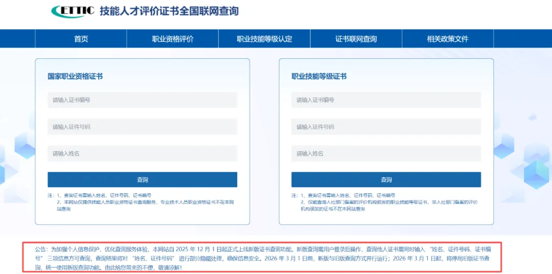 为保障个人信息安全,2025年12月1日本网站新版证书查询功能上线。新版证书查询方式说明如下: