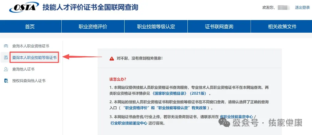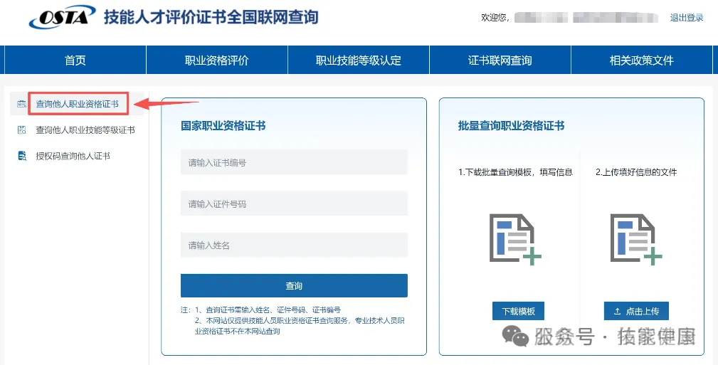 路径:登录后→左侧菜单栏→【查询他人职业资格证书/查询他人职业技能等级证书】步骤: