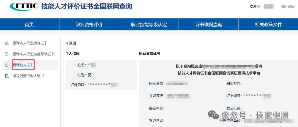 路径:左侧菜单栏→【查询他人证书】(或快捷查询框进入)。步骤:完整填写“证书编号、证件号码(身份证号)、姓名”,提交后显示查询结果(脱敏显示)。