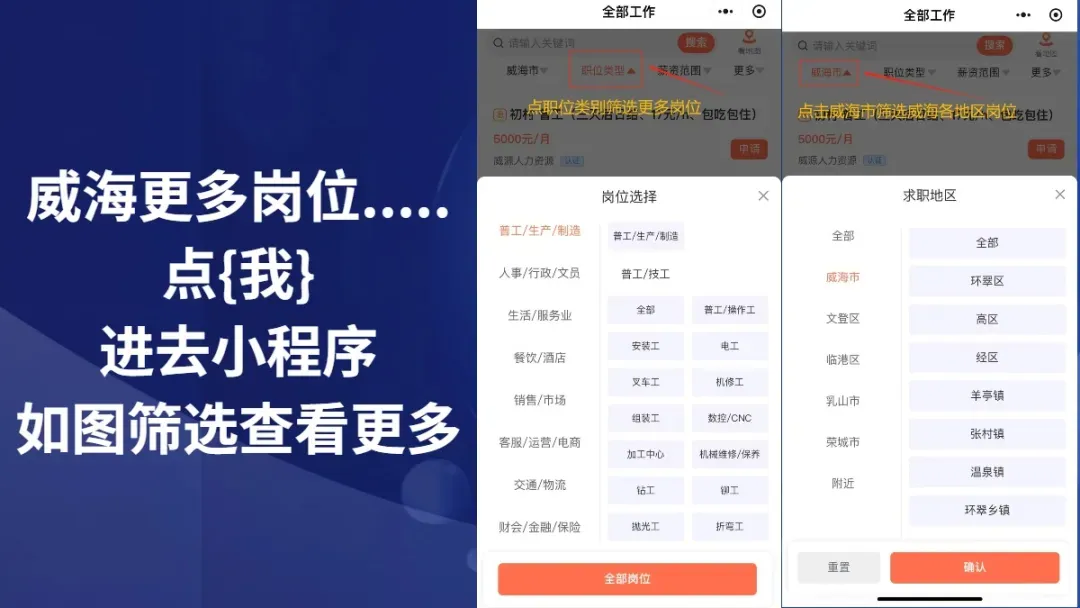 公司信息:地址:山东省威海市环翠区华夏路乐天世纪城-A座东北侧约100米公司信息:地址:山东省威海市环翠区华夏路乐天世纪城-A座东北侧约100米公司信息:地址:深圳路2-1号威力电动工具山东省威海市文登区深圳路2-1号威力电动工具公司信息:福利:包吃,包住,节日福利,加班补助,免费培训,环境好公司信息:地址:城区街道文苑小区5-8号山东省威海市乳山市城区街道文苑小区5-8号公司信息:福利:五险一金,节日福利,节假日休息,饭补,免费培训,环境好,带薪年假公司信息:福利:交社保,包吃,包住,环境好,带薪年假,节日福利公司信息:福利:包吃,包住,年终奖,节日福利,免费培训,环境好,班车接送咨询其他岗位,加小编微信