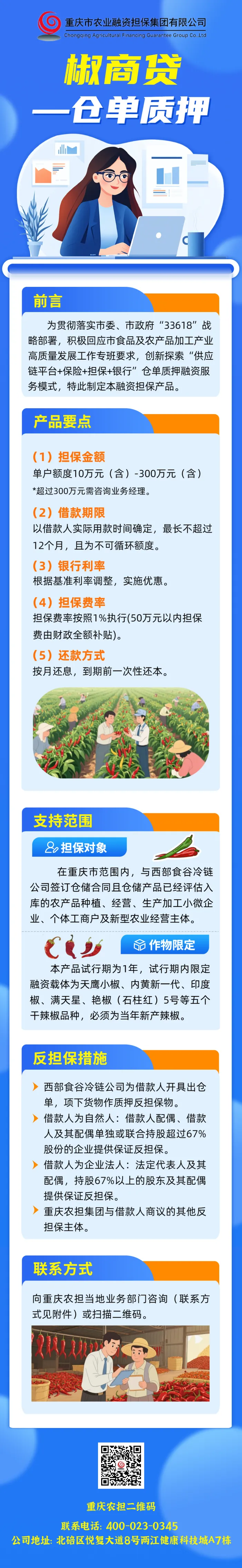 重庆农担是重庆市唯一加入国家农业信贷担保联盟的政策性农业担保机构,自成立以来,始终秉承“政策性、独立性、专业性”宗旨。重庆农担针对新型农业经营主体,深入分析农业产业链特征,系统研判行业生产经营风险,精心设计流程简便、标准清晰、效率快捷的系列融资担保产品,现陆续推出部分担保产品介绍,为金融支持农业经营主体产业发展提供指导。本期介绍“椒商贷—仓单质押”担保产品。