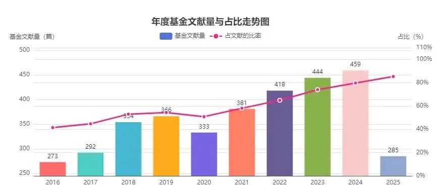 2025年85.33%, 2024年79.69%, 2023年74.0%, 近年来基金文献占比一再70%以上,故此有基金的论文过审率相对高一些