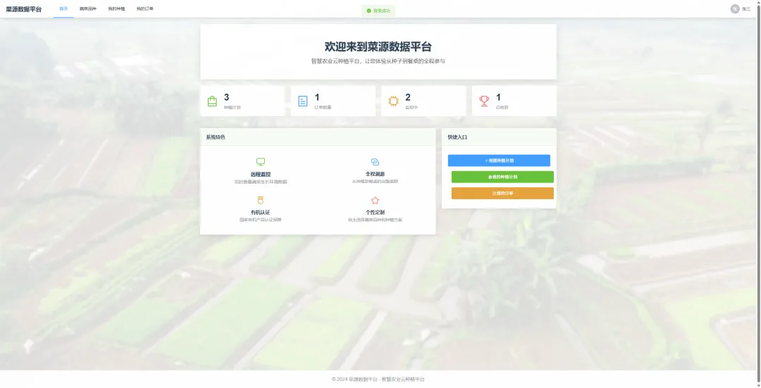 - RBAC动态权限:基于角色分配功能权限(如种植户无订单管理权限)。