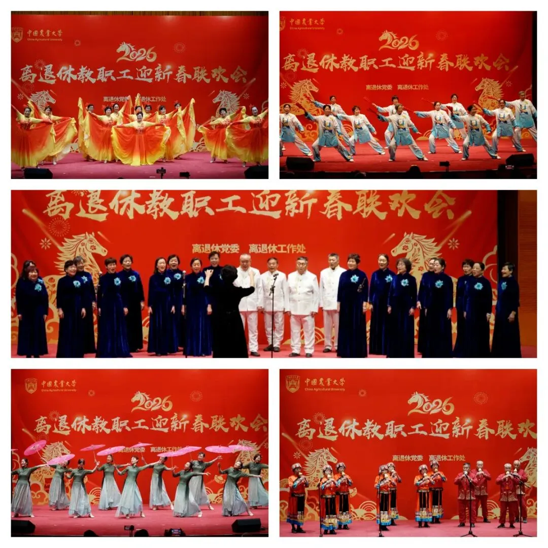 1月12日、13日,中国农业大学2026年离退休老同志新春联欢会分别在东、西区举行。学校党委书记钟登华、校长孙其信,党委副书记李培景与千余位老同志欢聚一堂,共迎农历马年新春,共话学校发展新篇。钟登华、孙其信代表学校向一直以来关心、支持、理解和帮助学校各项事业发展的离退休老同志们表示衷心感谢,向老同志们致以崇高的敬意和节日的问候,祝大家身体健康,万事如意。钟登华指出,在建校120周年之际,习近平总书记给中国农业大学全体师生回信,勉励我们要矢志强农报国,努力培养更多知农爱农的专业人才。2025年学校各项工作取得显著成效,高质量党建引领学校事业高质量发展,科技小院连续两年写入中央一号文件,高水平科研成果不断涌现,科研经费创历史新高,人才培养规模取得突破,人才自主培养质量持续提升,党风政风、师德师风、校风学风持续向好。孙其信表示,2025年是学校发展史上不平凡的一年,学校综合办学实力和学科建设水平实现历史性跨越,农业科学、植物与动物科学在全球大学与学科排行榜中位居世界大学第一;国家农业科技创新港所有批复项目全面开工。面向“十五五”发展新阶段,编制并实施好学校“十五五”事业发展规划,对加快建设中国特色、农业特色世界一流大学至关重要,希望老同志们一如既往地关心和支持学校发展,为学校高质量发展建言献策。东区会场,精彩瞬间。