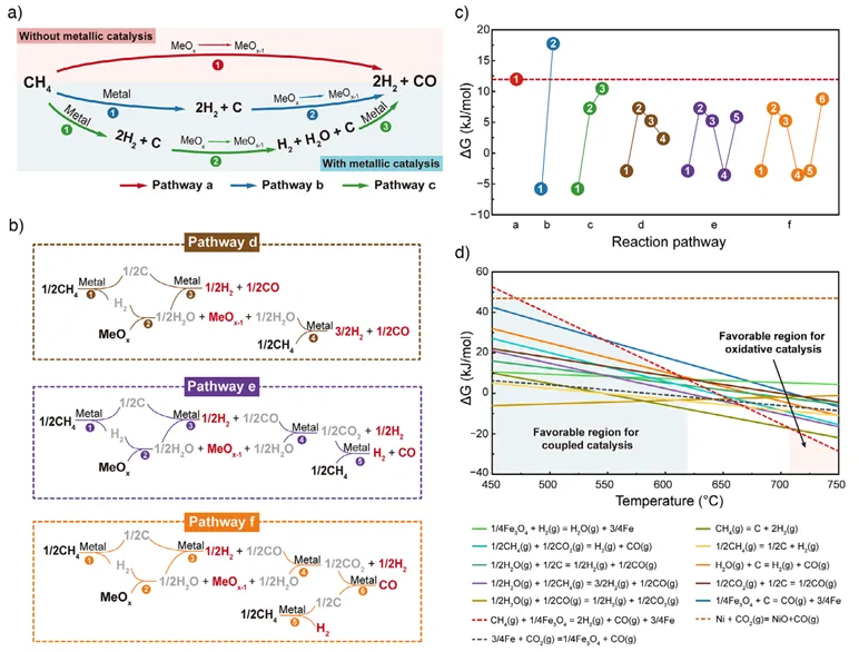 图1:耦合催化的反应网络研究和热力学见解。a)文献报道的反应途径和b)本研究中提出的耦合POR的金属和氧化催化的途径。c)通过连接编号的反应步骤显示的不同途径的热力学评估。d)CL-POR与Ni-POR的反应网络中涉及的反应的吉布斯自由能曲线。FeOx催化体系。