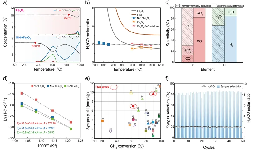 图2:Ni-FeOx催化体系的POR性能。a)在Fe3O4和Ni-10Fe3O4上甲烷程序升温重整过程中的气体浓度分布。b)热力学计算(线)和实验测定(正方形符号)H2/CO摩尔比作为温度的函数。c)在600 ℃下由于POR相对于Ni-10Fe3O4的CH4对H2和CO的选择性。d)使用不同Ni-FeOx催化体系的POR的Arrhenius图。e)Ni-5Fe3O4与其它金属-氧化物偶联催化剂的比较(实心符号)和氧化物催化剂不超过600 ℃、600 ℃至700 ℃和超过700 ℃的测试温度分别以圆形、三角形和正方形示出。f)在600 ℃下在Ni-5Fe3O4上进行的循环POR和氧化再生试验期间的合成气选择性和H2/CO摩尔比。