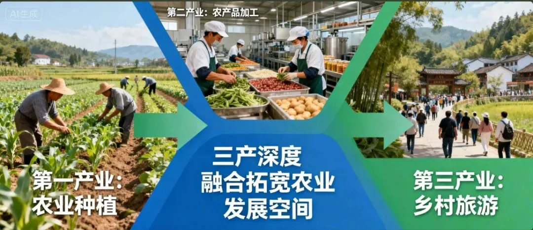 打破“农业=种地”认知,推动农业与加工、文旅、电商、康养深度融合:做精农产品精深加工(杂粮代餐、果蔬冻干、预制菜);做强休闲农业(采摘园、农耕体验、乡村民宿);做优康养农业,让单一产业变身复合产业。