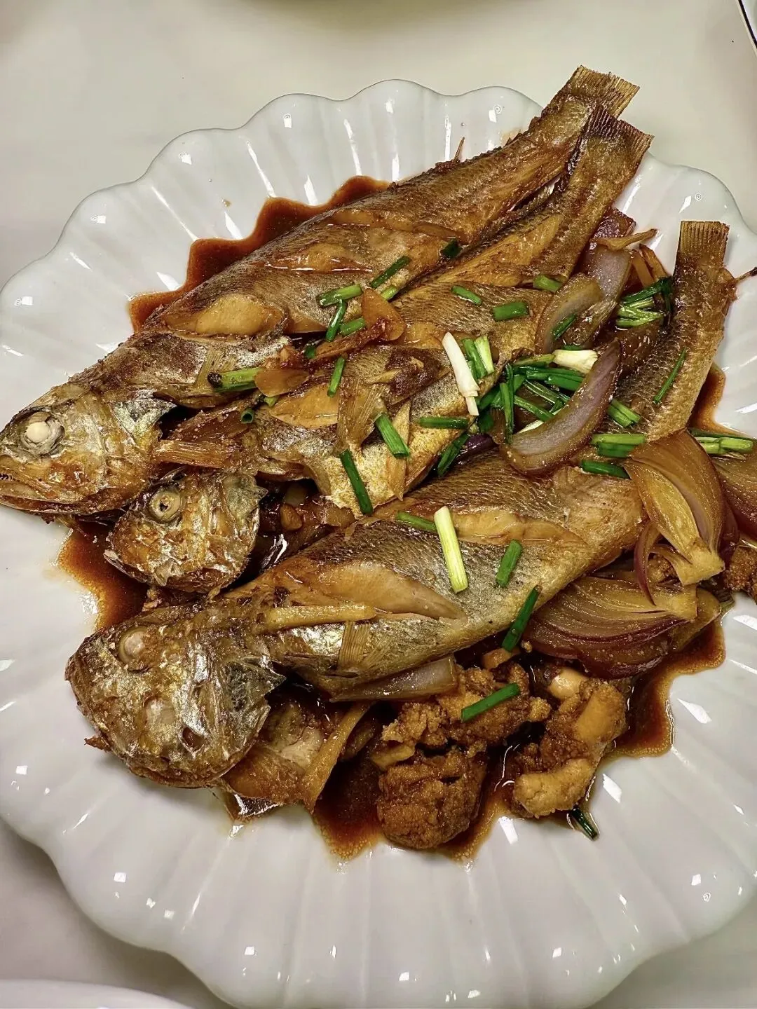 鱼身吸干水分煎至两面金黄,留底油爆香葱姜蒜,加生抽提鲜、老抽上色、少许白糖吊味,倒入清水焖煮3-4分钟,大火收汁至酱汁裹满鱼身,咸甜适口,配米饭能多吃两碗。