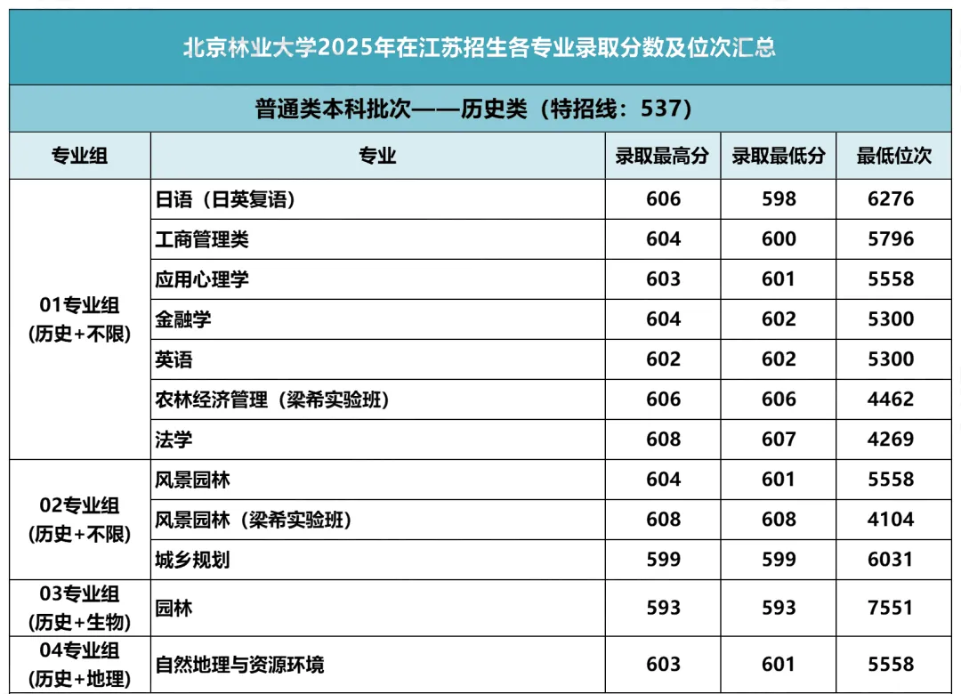 历史类最高608分(法学、风景园林【梁希实验班】),最低593分(园林)。