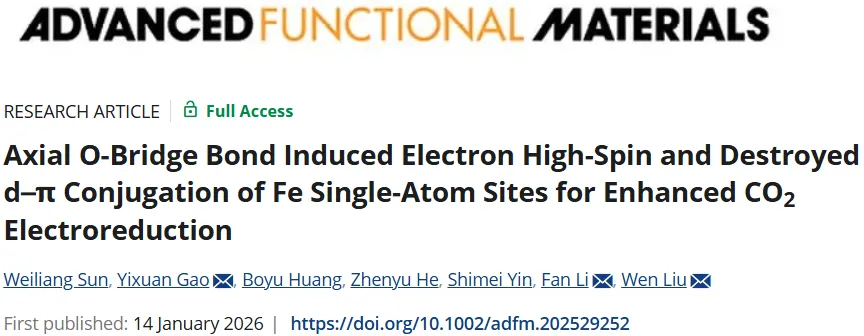 2026年01月14日,北京林业大学李璠、北京大学刘文/高艺轩团队合作在Advanced Functional Materials期刊发表题为“Axial O-Bridge Bond Induced Electron High-Spin and Destroyed d–π Conjugation of Fe Single-Atom Sites for Enhanced CO2 Electroreduction”的研究论文,北京林业大学/北京大学孙玮良为论文第一作者,刘文、李璠、高艺轩为论文共同通讯作者。