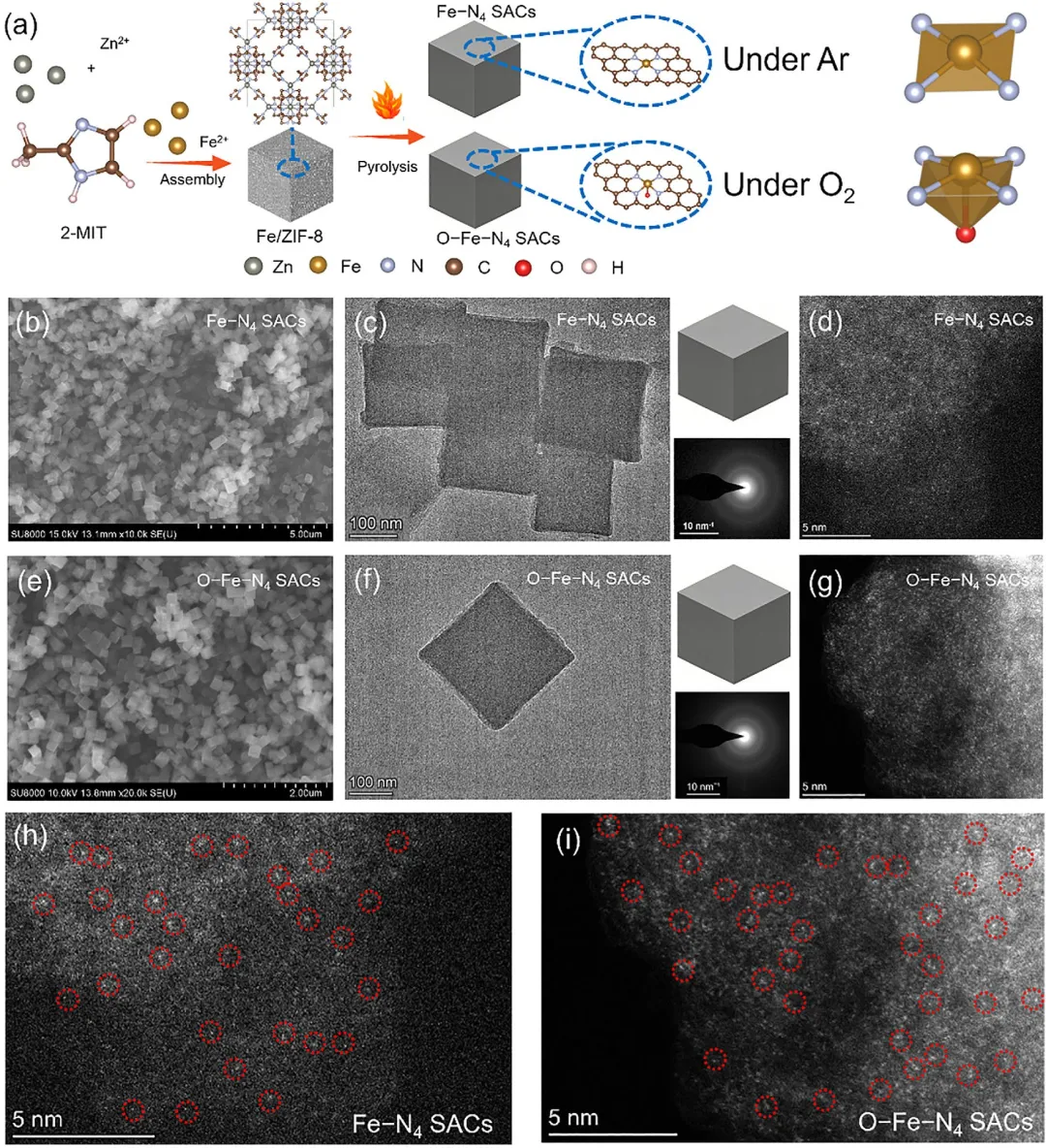 图 1 | 所开发催化剂的合成与表征。(a) Fe–N₄单原子催化剂和O–Fe–N₄单原子催化剂的合成示意图。(b, e) SEM图,(c, f) TEM图(右下角插图显示SAED图),以及(d, g) Fe–N₄单原子催化剂和O–Fe–N₄单原子催化剂的HAADF-AC-STEM图。(h) Fe–N₄和(i) O–Fe–N₄单原子催化剂的放大HAADF-AC-STEM图。
