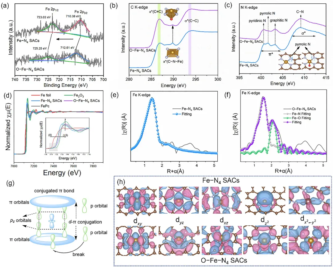 图 2 | 原子结构表征与Fe单原子位点的化学构型。(a) Fe 2p高分辨XPS谱图。(b) C K边和(c) N K边XANES谱图(插图:优化结构模型)。(d) 归一化Fe K边XANES谱图。(e) Fe–N₄单原子催化剂和(f) O–Fe–N₄单原子催化剂的FT k²加权Fe K边EXAFS谱图及相应的EXAFS拟合结果。(g) d-π共轭结构破坏示意图。(h) dxy, dyz, dz², dxz和dₓ²–ᵧ²轨道的波函数。