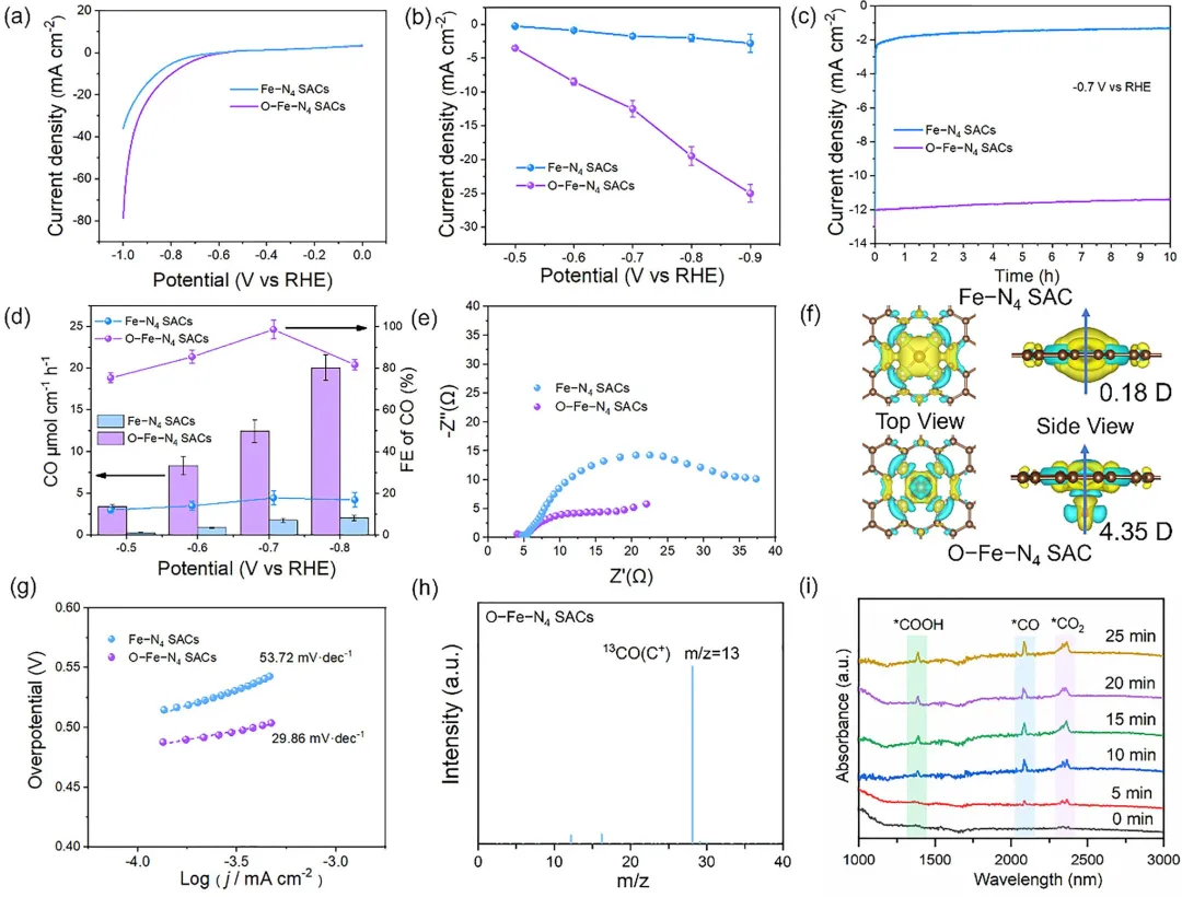 图 3 | CO₂还原的电化学性能。(a) LSV测试,(b) JCO,(c) 长期循环稳定性,(d) FECO,(e) EIS,(f) 电荷密度差,(g) 不同催化剂的Tafel曲线。(h) O–Fe–N₄单原子催化剂的GC-MS对¹³CO产物的分析。(i) CO₂RR过程中O–Fe–N₄单原子催化剂的原位ATR-FTIR分析。(b)和(d)中的数据为三次独立实验的平均值±标准偏差(n=3)。