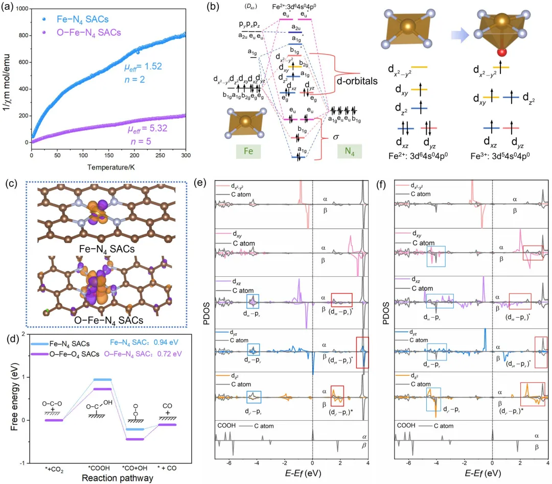 图 4 | 电子自旋态表征、Fe配位构型与DOS谱图。(a) 由M-T测试获得的1/χ图及μeff。(b) Fe–N₄和O–Fe–N₄单原子催化剂的表面自旋电子与群轨道。(c) Fe–N₄和O–Fe–N₄单原子催化剂的自旋电子密度。(d) CO₂RR路径的能量变化曲线。(e) Fe–N₄单原子催化剂和(f) O–Fe–N₄单原子催化剂上Fe单原子位点吸附*COOH的PDOS。
