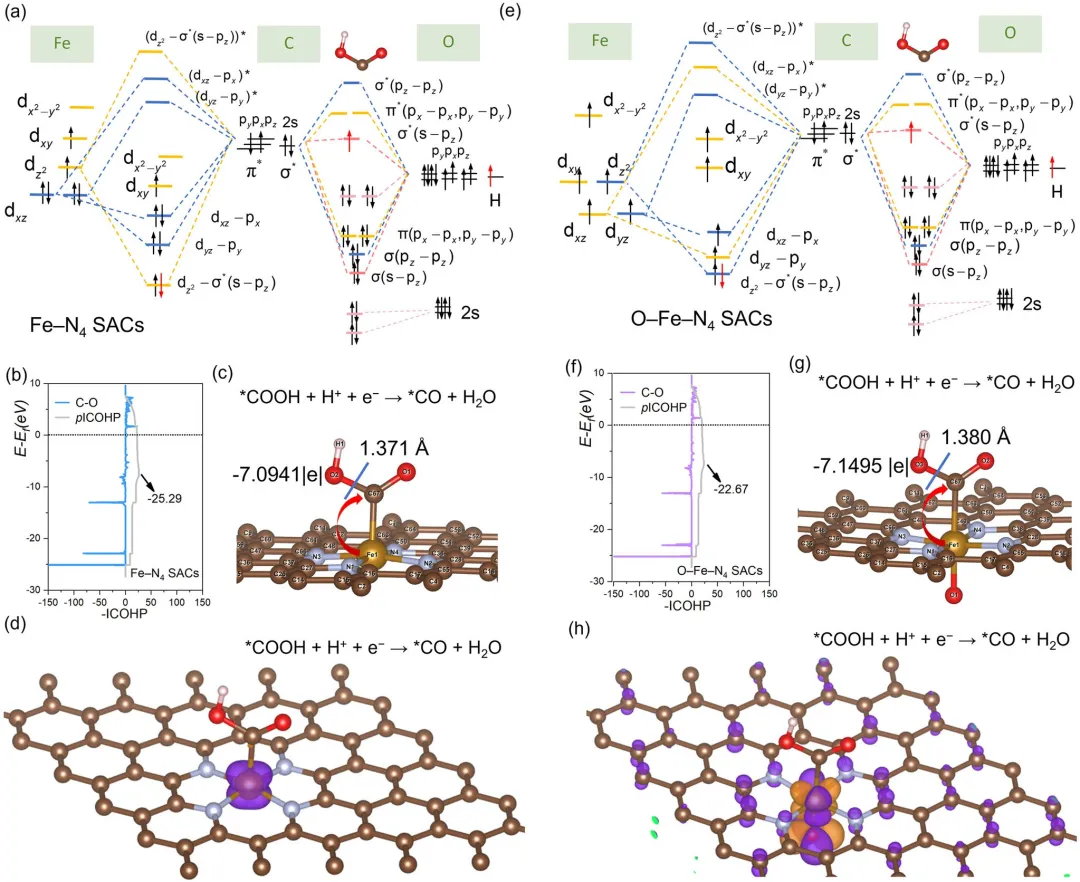 图 5 | Fe–N₄和O–Fe–N₄单原子催化剂中Fe自旋构型与-COOH分子轨道图。吸附COOH的Fe与C原子间成键与反键轨道的示意图(a, e)。(b) Fe–N₄单原子催化剂和(f) O–Fe–N₄单原子催化剂中*COOH的C–OH键的pCOOH与-pCOOH。(c) Fe–N₄单原子催化剂和(g) O–Fe–N₄单原子催化剂中*COOH的Bader电荷与键长。(d) Fe–N₄单原子催化剂和(h) O–Fe–N₄单原子催化剂在吸附COOH后Fe单原子位点的自旋电子密度。
