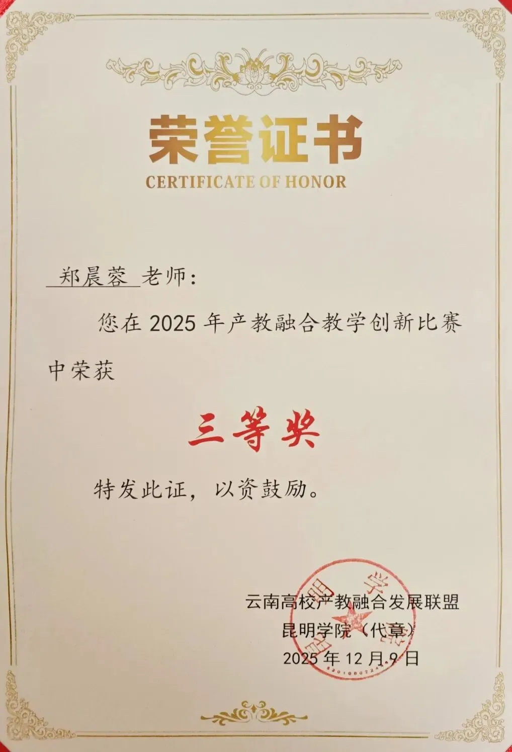 近日,由凌云律师事务所业务委员会主席李春光带队,党兴成、胡舰月、刘志琼律师与西南林业大学文法学院共同设计实施的产教融合课程,在云南省产教融合教学比赛中荣获三等奖。