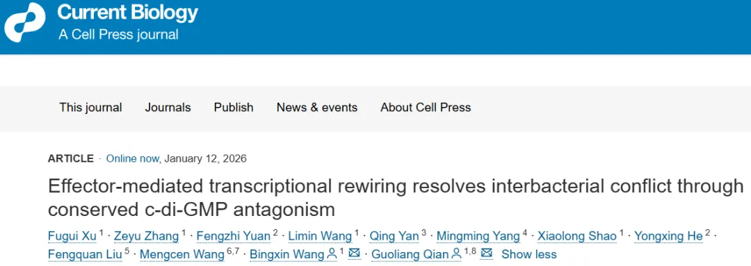 近日,南京农业大学植物保护学院钱国良教授团队在国际知名期刊Current Biology发表了题为“Effector-Mediated Transcriptional Rewiring Resolves Interbacterial Conflict Through Conserved c-di-GMP Antagonism”的研究论文。
