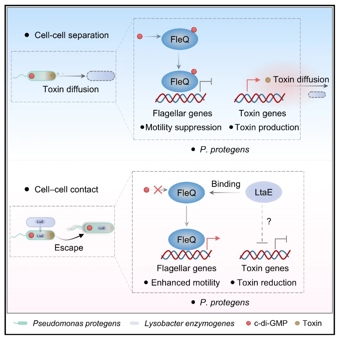 该研究以生防细菌产酶溶杆菌(Lysobacter enzymogenes)与防御假单胞菌(Pseudomonas protegens)为模型,首次揭示了一种细菌解决种间冲突的全新范式——“防御-逃逸”(Defense-Escape)。研究发现,细菌不仅能防御竞争者的攻击,更能通过转录重编程,“劫持”敌方的效应蛋白作为信号分子,从而解除自身的运动抑制,实现战术突围。