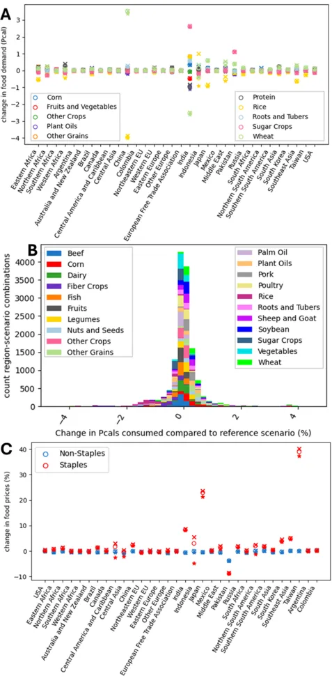 GCAM-pyrolysis评估了热解引入对全球食物供应和价格的影响。模型预测,与参考情景相比,2050年大多数区域的食物生产几乎没有相关变化。净全球卡路里增加主要来自小麦、糖作物、其他谷物和玉米,而以水稻为代价。在价格方面,全球水平上,GCAM-pyrolysis预测主食价格将上涨2.96%(中位数2.37-3.37% CE),非主食价格下降0.26%(中位数0.18-0.33% CE)。然而,这些价格变化并非均匀分布,某些地区的主食价格涨幅超过10%,引发食品可负担性和空间公平关切。经济影响估计