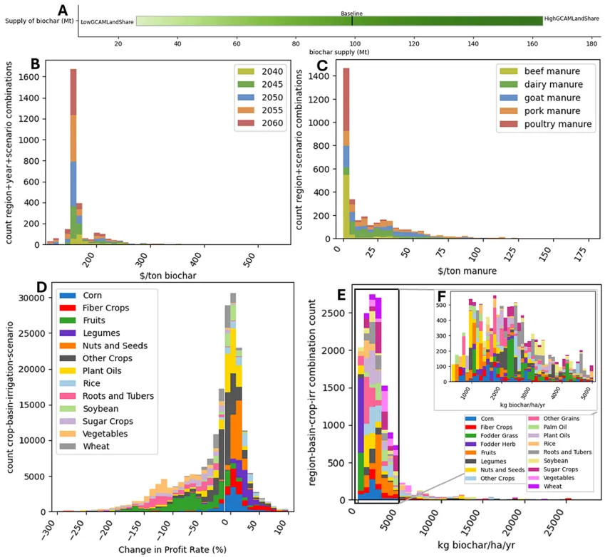 热解系统的经济可行性是广泛采用的关键。GCAM-pyrolysis估计生物炭供应量因情景而异,基线情景下略低于100万吨/年。对农民而言,生物炭市场价格在采用初期保持高位,到世纪中叶区域中位数价格收敛于151-213美元/吨生物炭。饲料价格相对较低,家禽和牛肉粪便最便宜,使其对热解厂运营商具有吸引力。然而,使用生物炭作为土壤改良剂的农民盈利能力因作物和区域而异。许多作物的利润率显著低于采用"高"管理策略的相同土地,许多利润为负值。全球土地利用变化