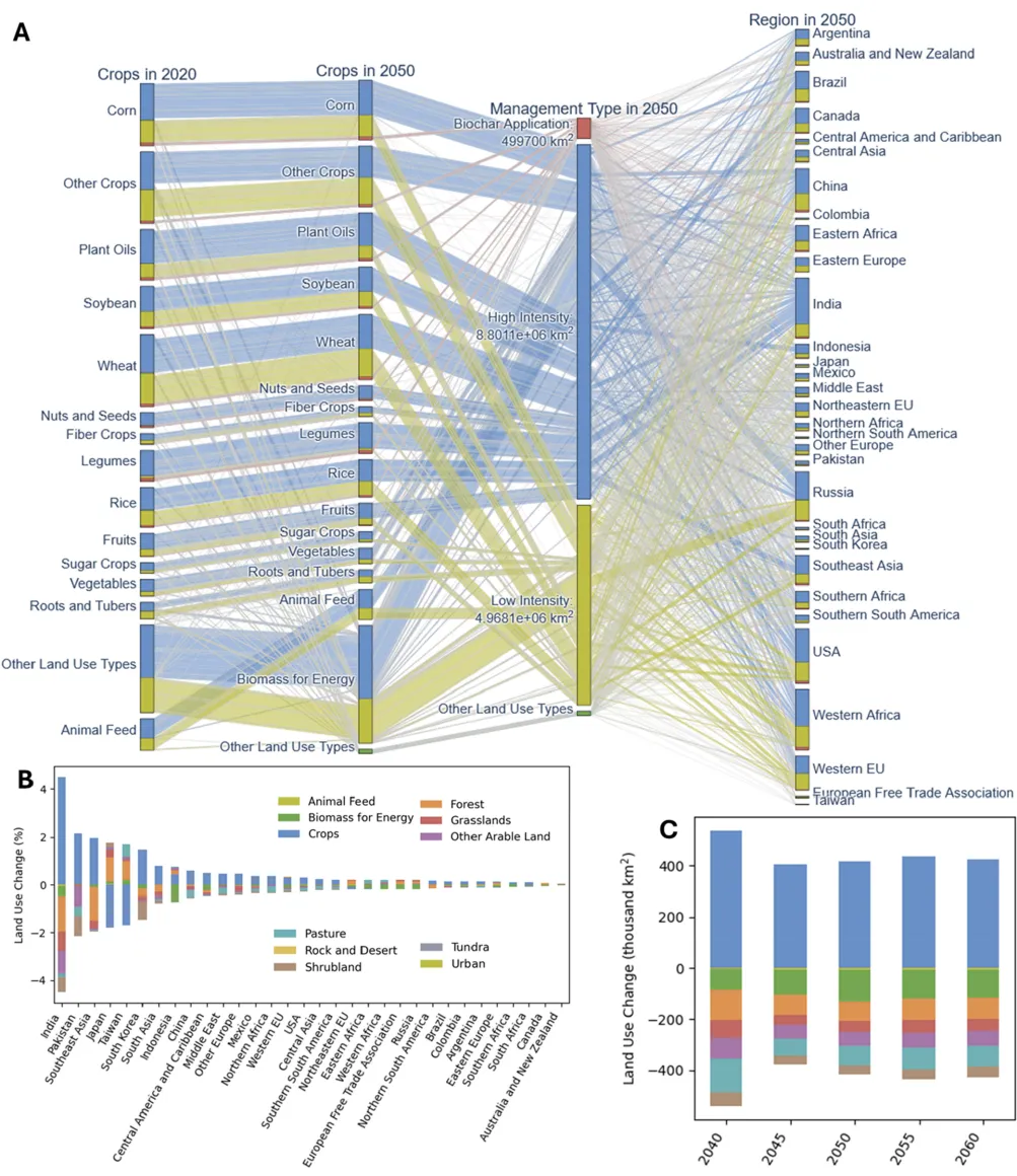 评估热解引入引起的土地利用变化至关重要。GCAM-pyrolysis估计,2050年全球共有583,400 km²耕地(中位数511,600-640,700 km² CE)将施用生物炭,占耕地总面积的3.5%。这些土地主要用于种植玉米、豆类、小麦、植物油和其他作物。与参考情景相比,用于粮食生产的土地面积增加415,000 km²(中位数376,000-473,000 km² CE),同时大多数情景下用于生物能源作物生产的土地供应减少,森林和牧场土地也减少。区域层面显示,印度、巴基斯坦和东南亚等地区因土地利用变化和栖息地丧失而具有较高的生物多样性或生态系统影响风险。牲畜生产输入输出变化