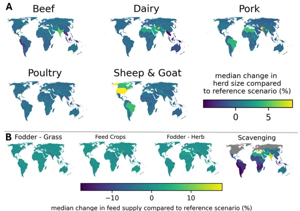 热解对牲畜生产的影响通过评估畜群规模和饲料需求来量化。全球尺度上,GCAM-pyrolysis预测,与参考情景相比,生物炭生产系统的采用不会引起牲畜产品供应的相关变化(中位数增加0.23%)。饲料需求方面,2050年全球尺度几乎无变化(中位数增加0.05%)。虽然模型预测区域差异,但对大多数区域而言,这些差异几乎中性。某些饲料来源的变化,如非欧盟欧洲国家和印度的清道夫饲养大幅增加,非洲和美洲的清道夫饲养大幅减少,但其他饲料来源的变化与参考情景无显著差异。碳 dioxide 去除与温室气体减排
