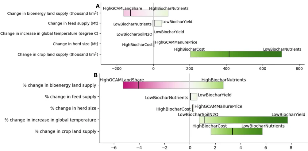 由于关键模型参数的高度不确定性,进行了敏感性分析。与GCAM 7.1版相比,关键参数变化很小,特别是在相对变化方面。所有情景均导致2050年全球温度高于参考情景。这种微小但持久的差异表明两种潜在原因:生物能源在能源部门可能贡献更多碳 dioxide 去除和温室气体减排;或者生物炭的碳 dioxide 去除和温室气体减排可能间接 enable 经济其他部门的温室气体排放。土地利用变化排放的置信区间 alone 压倒了生物炭温室气体减排和碳 dioxide 去除的更可靠估计,可能高估了总结果。政策建议与讨论