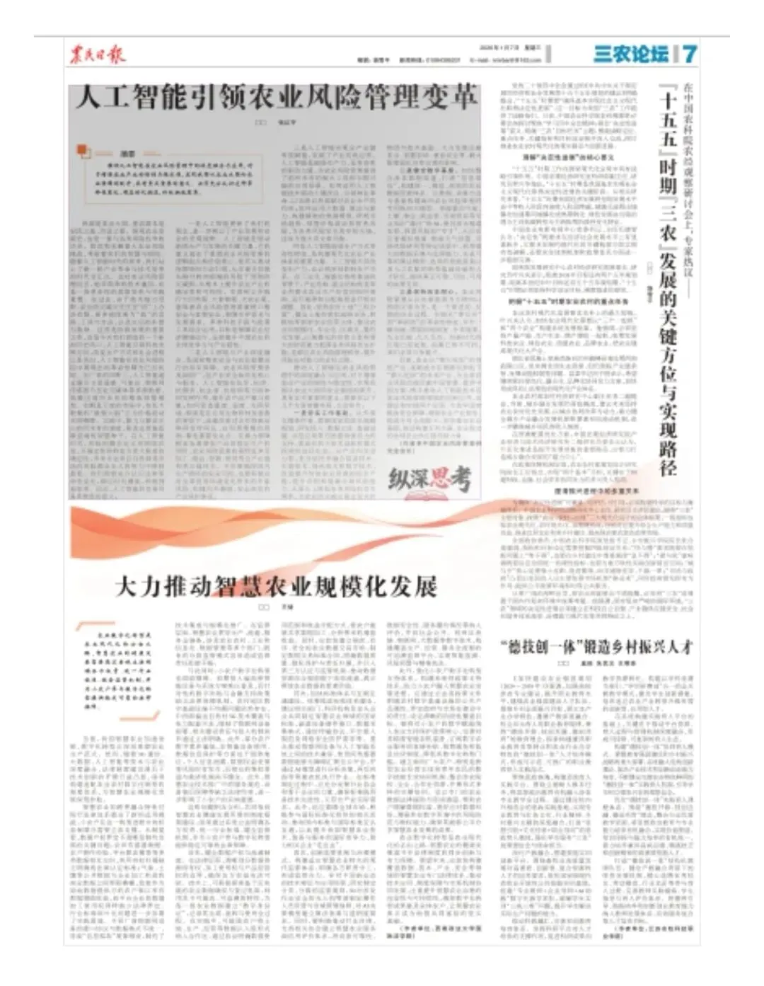 目前,农业从“靠天吃饭”的传统产业,逐渐成为在智能化护航下“靠人吃饭”的未来产业,为全球农业风险治理贡献中国智慧、提供中国方案,携手推动人工智能技术在农业风险管理领域的创新应用,在理论和实践两个层面,为筑牢国家粮食安全屏障,增强农业产业韧性,推进乡村全面振兴,加快建设农业强国,推动构建互利共赢、安全稳定的全球农业供应链贡献力量。
