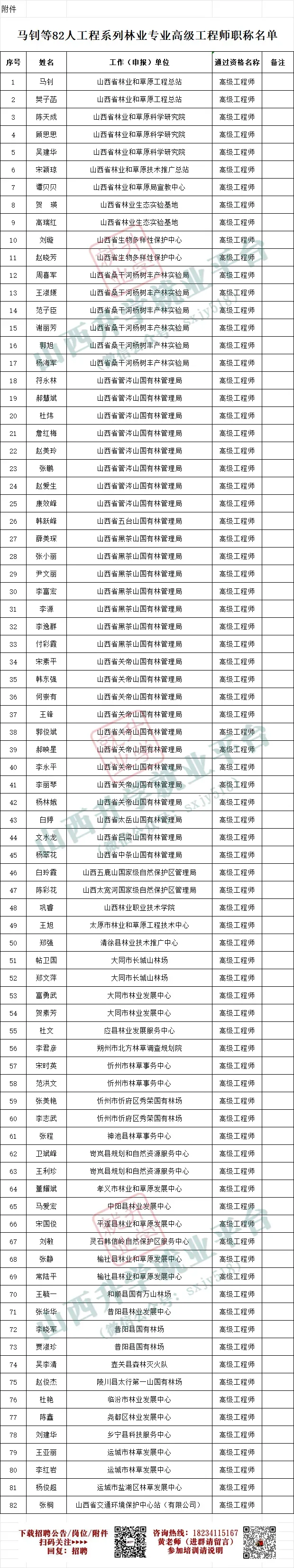 经审核,同意山西省工程系列林业专业高级工程师评审委员会于2025年12月26日评审通过的马钊等82人工程系列林业专业高级工程师职称评审结果,现予以公布。