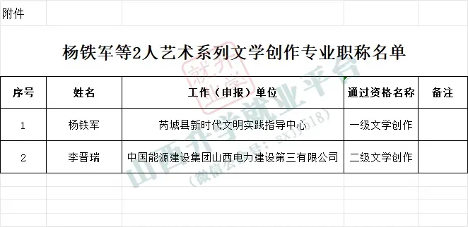 经审核,同意山西省艺术系列文学创作专业高级职称评审委员会于2025年12月14日评审通过的杨铁军等2人艺术系列文学创作专业职称评审结果,现予以公布。