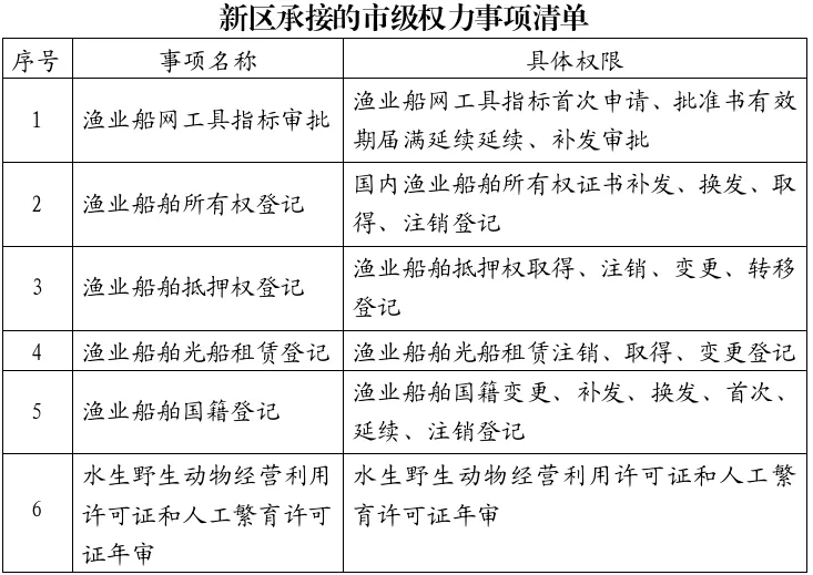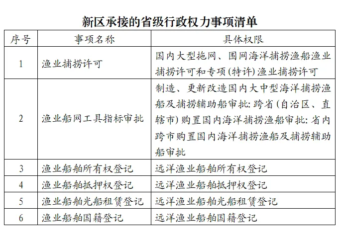 积极承接省级赋权事项,实现渔民在新区办理部分省级权限审批业务,让渔民办事少跑腿、更省心。2025年,办理省级赋权事项273项,其中渔业船舶抵押权登记3项,渔业船网工具控制指标审批151项,捕捞许可证119项;办理市级下放事项35项,其中渔业船网工具指标审批27项,渔业船舶国籍登记4项,渔业船舶所有权登记1项,渔业船舶抵押权登记3项。